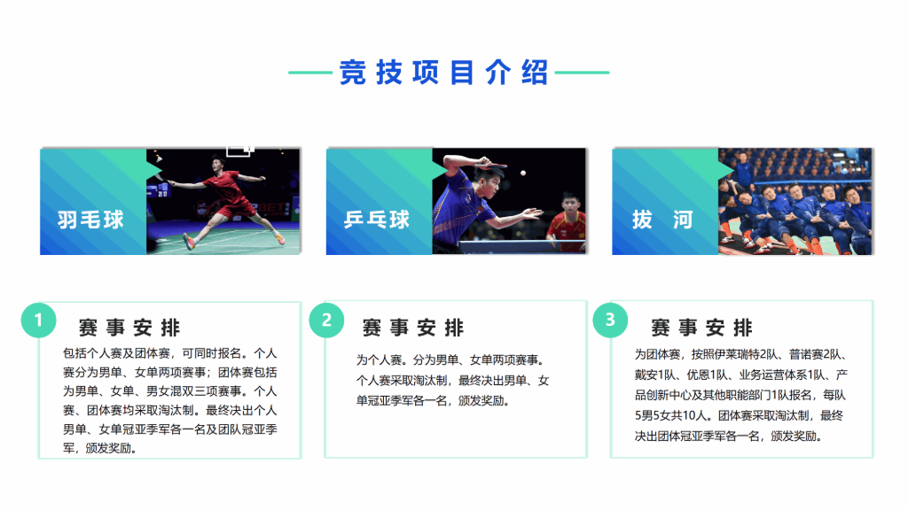 团队赛:羽毛球、拔河团队赛,由各子公司统一报名