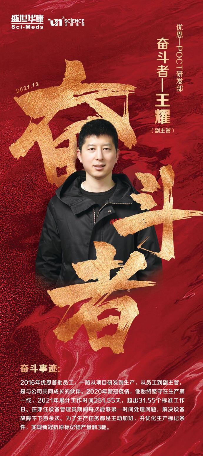 自2020新冠疫情来,始终坚守生产一线,2021年至今累计工作时间251.55天(标准工作日为222天),超出31.55个工作日,平均日工时均超过了10h。在这期间总能在公司看到他忙碌的身影,在生产中任何岗位都能胜任且都有较强的执行力,不管其余同事加班都多晚,他都能坚守到最后。他还担任的设备管理员的职责,在全年近千万人份的生产过程中,处理设备故障百余次,在设备出现问题时,同事第一个想到就是他,他也总能够第一时间处理解决。特别是在新冠生产期间,每天都8点之前到岗,因为生产车间的空调系统需运行半个小时以上才能正常工作,他每天都坚持提前到岗将空调系统开启,在其余同事加班完后,再关闭空调系统并检查其它设备的运行状态,为后续的生产提供便利。他都是在别人看不到的地方默默的付出。负责标记工作时,整合资源,建立研发、生产标记流程,减少了研发人员大量的标记时间,加快了研发的进度,在大批量生产期间,为了生产任务都是主动加班,并优化生产标记条件,让新冠抗原标记物产量翻了3