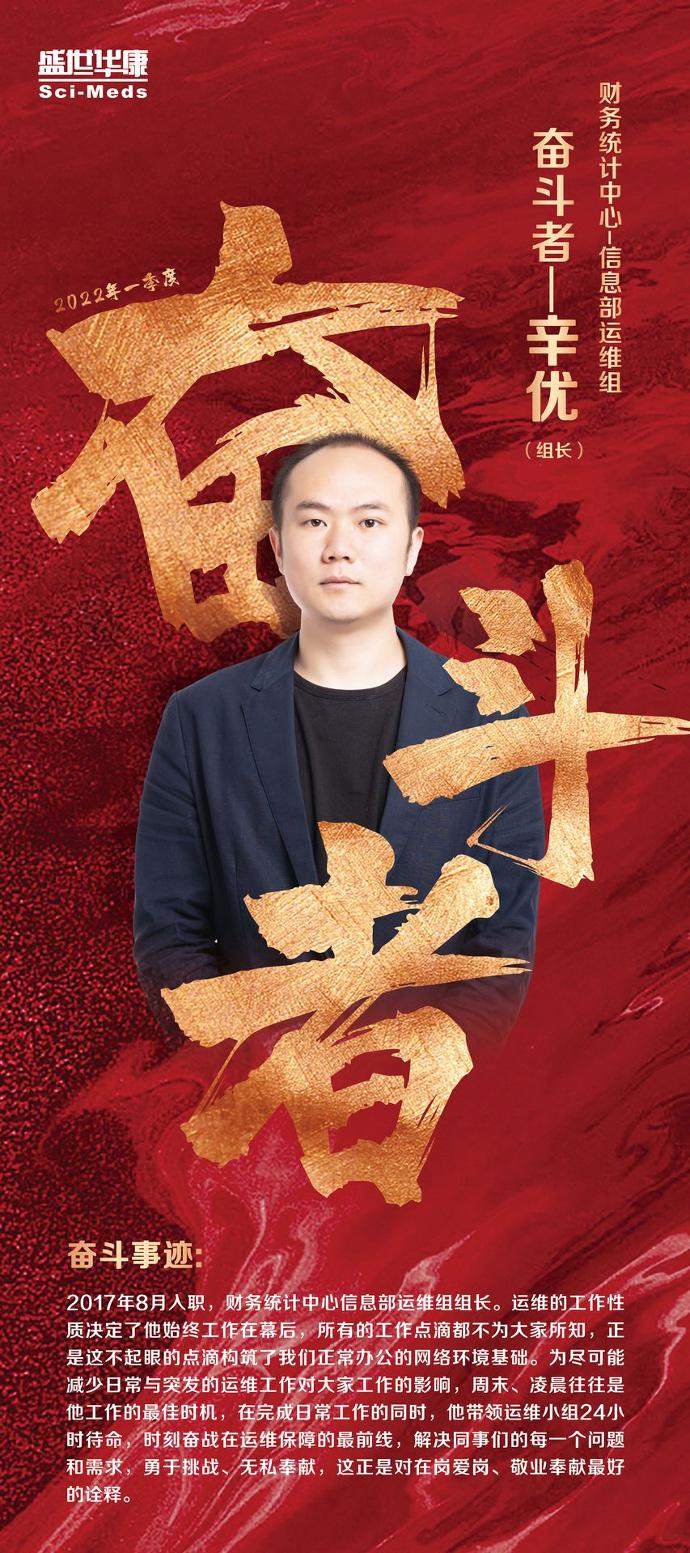 在岗爱岗 ,我们每位同学都在盛世华康独一无二的岗位上工作,有的岗位重要,有的岗位平凡,热爱自己工作岗位的程度,是自己对自己工作能力最真实的评价。在岗与爱岗具有一体两面性,辛优能五年如一日的保持对运维工作的高度热情,除了是对岗位的热爱,还有对这份工作的责任心与工作技能的自信心。 爱岗敬业 ,何谓敬业?在好多年前,总有人问我是从事什么行业,主要做哪些工作,虽然我只是个会敲几行代码的IT民工,但是我热爱我的职业,我在从事编程的工作中收获了无尽的新知识、创造新逻辑展现的成就感,所以回答:程序员,在电脑上写程序的。那么,你一定会修电脑了!在长达好几年的时间里,我对于这种问题都是很生气的,我觉得你可以质疑和歪曲我的技能,但是你不能影响我对我职业的热爱。到现在一种职业逐渐细化成各种相关的岗位之后,人们更加淡化了对各种平凡岗位的敬畏之心。早些年,我曾与辛优有过一段对话: “运维的工资全公司最低要干的活最多,没有任何人在日常的工作中记得你的存在,除非是死机、断网出故障。“ “我的工作职责就是保障公司的网络与硬件运行正常,我热爱我的工作,如果出了问题,那就是我的工作没有做好,我宁可大家都不认识我,也不能让大家质疑我不专业,不敬业。” 之后的日子,他确实将敬业做到极致,他选择了在这个岗位上兢兢业业,这个岗位更是成就了这一平凡岗位上的奋斗者。 敬业奉献 ,奉献不同于贡献,根据现代汉语词典上的解释,贡献虽然也有无偿的含义,但是更多的是指有偿,下级向上级献出。奉献,无私的崇高的一种价值意识,我更愿意把公司比作一栋摩天大楼,我们每位同学都是不可少的一块砖,有的砖被安排到承重墙的位置,有的砖被用作了无数的支点,每一块砖都做到了爱岗敬业的同时,有一些砖逐渐产生了团体价值意识,认识到无论自己所在的位置是重要还是平凡,都是保持这座楼房健康稳固的基础,那么,奋斗者产生了,他们在各自的岗位上创造价值,用于挑战,无私奉献,影响着身边的同事。我想,奋斗原力不断在公司被传播、传承,才是奋斗者评选的最终意义。 在此,感谢公司提供的奋斗者平台让更多优秀的人物事迹被大家所认知,特别鸣谢冷总对认知与心知的解惑,感谢我的领导刘旻总经理对我们团队的信任以及部门成绩的肯定,感恩团队带给我们无比坚定的凝聚力与自豪感。