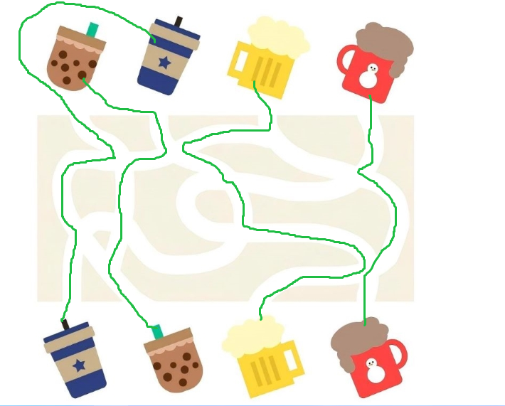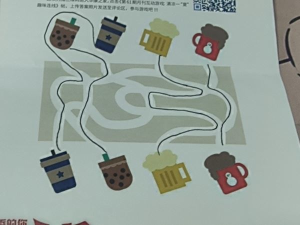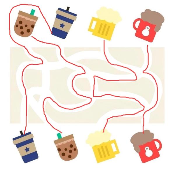 奶茶咖啡啤酒热可可,通过白色通道连接相同的2杯,一起干杯吧 ☕️ !注意连线不可交叉 🚫 ,否则视为失败!完成连线,拍摄📸你的答案并将照片 上传至下方评论区。