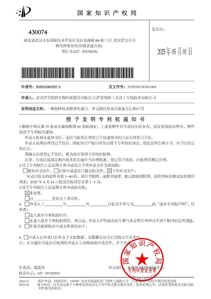 2025年4~5月,从国家知识产权局网站获悉,戴安公司《一种末端脱氧核糖核苷酸转移酶变体及核酸、试剂盒》、伊莱瑞特(武汉)公司《一种猴降钙素原重组蛋白、单克隆抗体及其制备方法和应用》,通过湖北省知识产权保护中心快速审查通道,均已获得授权。