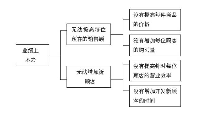 假设你是一名营业员,但实际业绩总是上不去,要寻找该问题的原因,需要按照逻辑树的方式,深入分析原因,如下图所示。