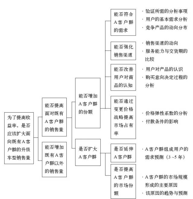 例:假设在验证“为了提高收益率,是否应该扩大面向既有A客户群的升级车型销售量”这一论点时,不漏不重地分解要点树,就可以发现需要验证的各个要素,包括市场扩大的可能性、对客户需求的把握,以及与销售渠道、与价格相关的要素等。
