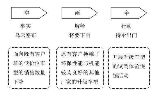 “空”指的是事实,即现状如何;“雨”指的是意义,即这种现状意味着什么;而“伞”指的则是解决方案与对策,即从该意义推导出要做什么。空雨伞连起来,即是,“天空出现雨云→因此下雨的可能性很大→应当携带雨伞”。
