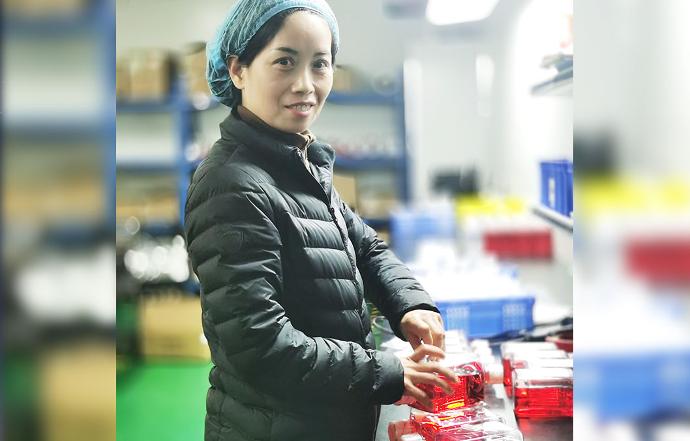 朱晓芳身为灯检组的一员,工作内容是为生产好的试剂做检测的最后一关。发现产品是否有杂质,沉淀,析出,污染和一些外观的问题。这些是作为产品是否可以发货的重要依据。长期的工作练就了一双火眼精睛。善于发现旁人忽略和看不出来的质量问题。丰富的灯检经验也为发货的同事排除了很多错误,为发货和产品质量流程做出了贡献。长期的工作环境处在昏暗的光线下,观察强光下的试剂更能发现问题。对人的视力是有影响的,经常眼干眼涩。良好的工作态度让她对这些都不怎么在乎,总是认真完成手头的工作,随时看见她都是在货堆里点着一束光工作。——王运江投稿
