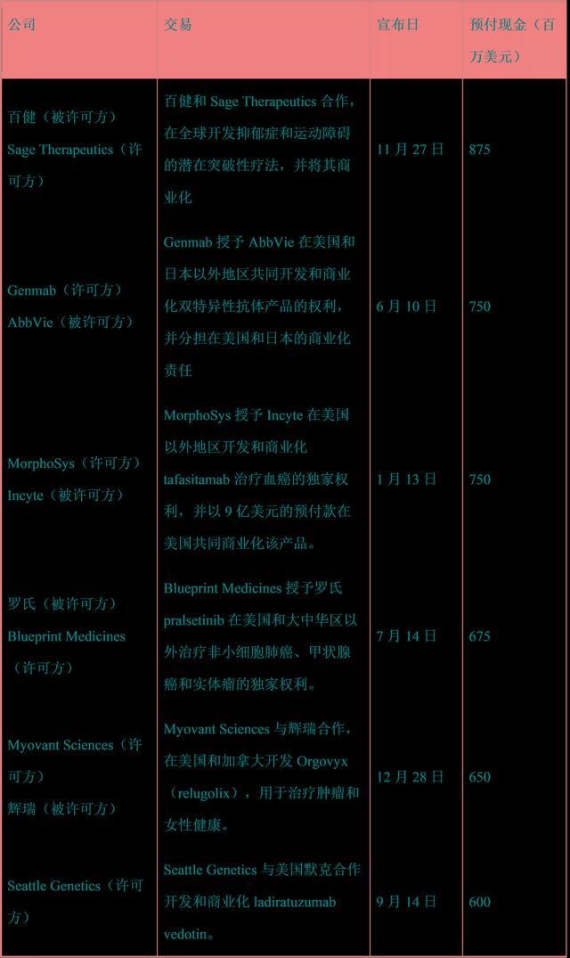 表3. 2020 年十大授权交易。2020 年共有 27 笔合作协议的预付现金超过 1 亿美元,这一数据是 2019 年的两倍多,其中癌症占主导地位,但疫情大流行将传染病推升至第二位,占到了 100 笔(前一年只有 28 笔),取代了神经病学(来源:BioCentury BCIQ)