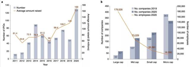 图1.a 自 2011 年起的 IPO,该数据显示了上市公司的数量和体量。b 按市值划分的公司及其员工数量。大市值,>50 亿美元;中市值:10-50 亿美元;小市值,2.5-10 亿美元;微型市值,<2.5 亿美元。